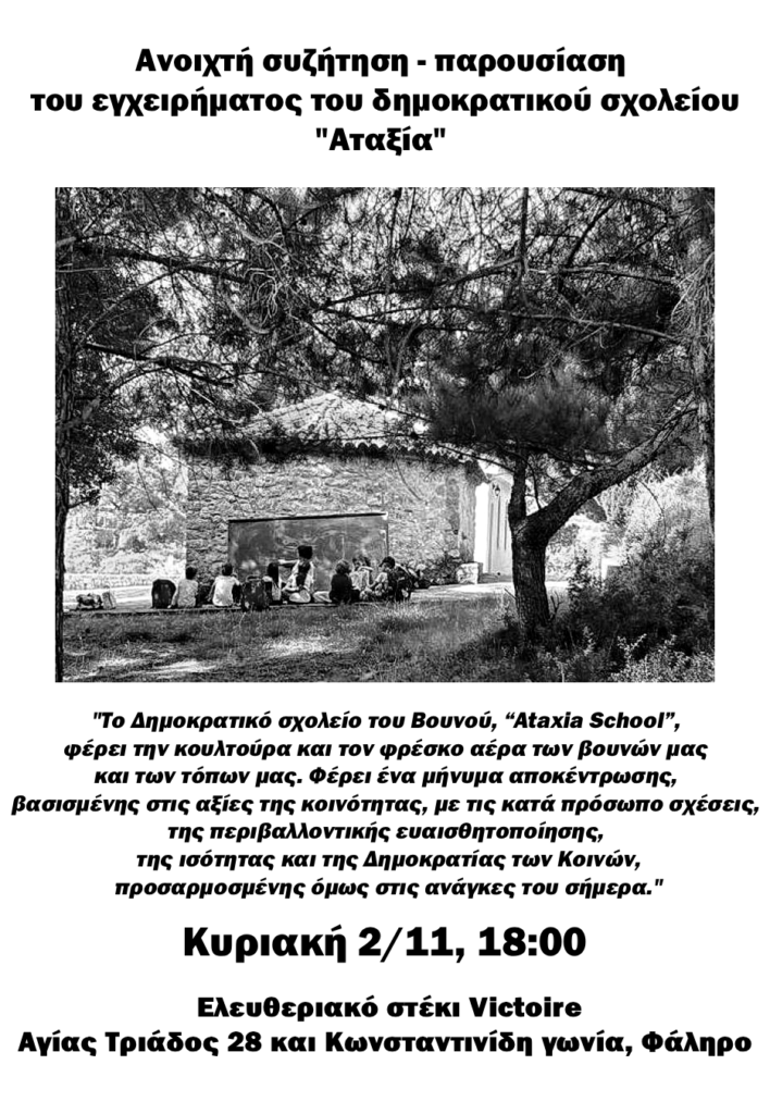 Την Κυριακή φιλοξενούμε το Ataxia school, το δημοκρατικό σχολείο του βουνού. Το συγκεκριμένο σχολείο ενσαρκώνει τις αξίες της κοινότητας, της περιβαλλοντικής μέριμνας, της ισότητας καθώς και της οργανωτικής αποκέντρωσης.