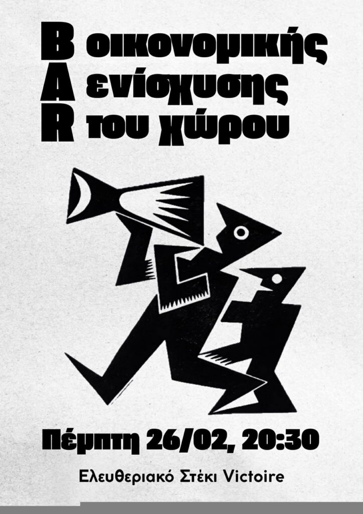 Bar οικονομικής οικονομικής ενίσχυσης του χώρου μετά την φασιστική επίθεση – Πέμπτη 26/2 στις 20:30 Posted on 2026/02/262026/02/26 by victoire Bar οικονομικής ενίσχυσης του Ελευθεριακού Στεκιού Victoire μετά την φασιστική επίθεση στον χώρο – Πέμπτη 26/2 στις 20:30